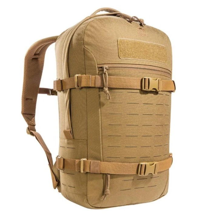Modular daypack with 23 liters of Volume. The backside of the main compartment of the daypack is lined with MOLLE hook panels for attaching compatible loop pouches. It is also designed to hold a 15.4″ laptop. The flat zipper front pocket is great for documents while the laser-cut MOLLE on the front and sides allow you to add gear to suit your needs.