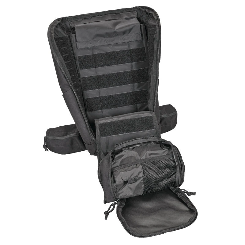Deployment backpack for undercover deployments or civilian use. The main compartment of the backpack can be opened completely from the front or back side, and the hook and loop partition can be removed all together if need be. The back and side panels of the main compartment feature MOLLE hook and loop patches for customizable configurations. The backpack has a large lid compartment and organizer pockets on the sides. The lid compartment features hook and loop panels for magazine pouches. The hip belt with zipper pockets on the hip flaps can be removed. In the bottom panel of the backpack is a signal flap for emergency unit patches, which can be quickly fastened to the hook and loop front of the pack if need be. All zippers on the backpack are lockable.