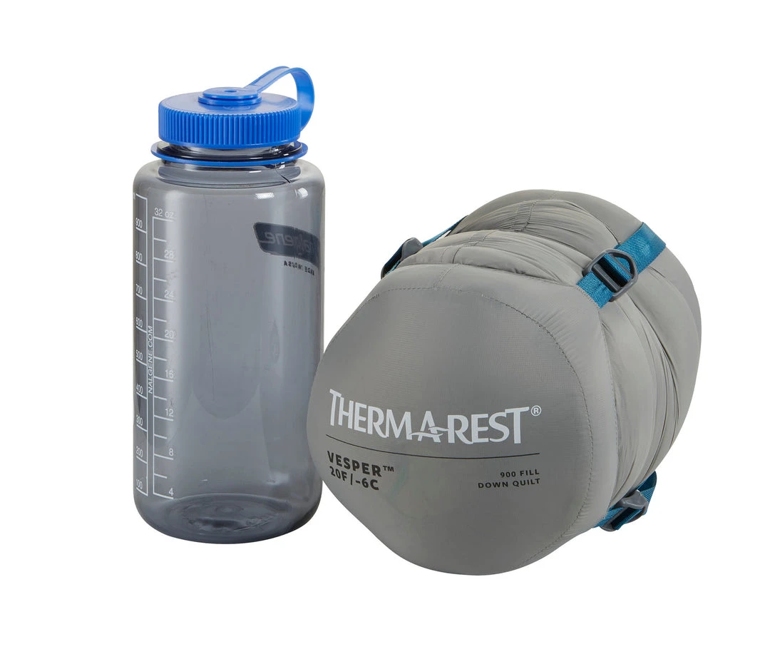 Featuring unrivaled packability and featherweight design, the Vesper 20F/-6C quilt provides no-frills camp comfort. The quilt uses thermally-efficient box baffled construction to maximize warmth and comfort for a high-performance, ultralight piece. The Vesper was designed with high-quality materials and Therm-a-Rest performance features like a SynergyLink