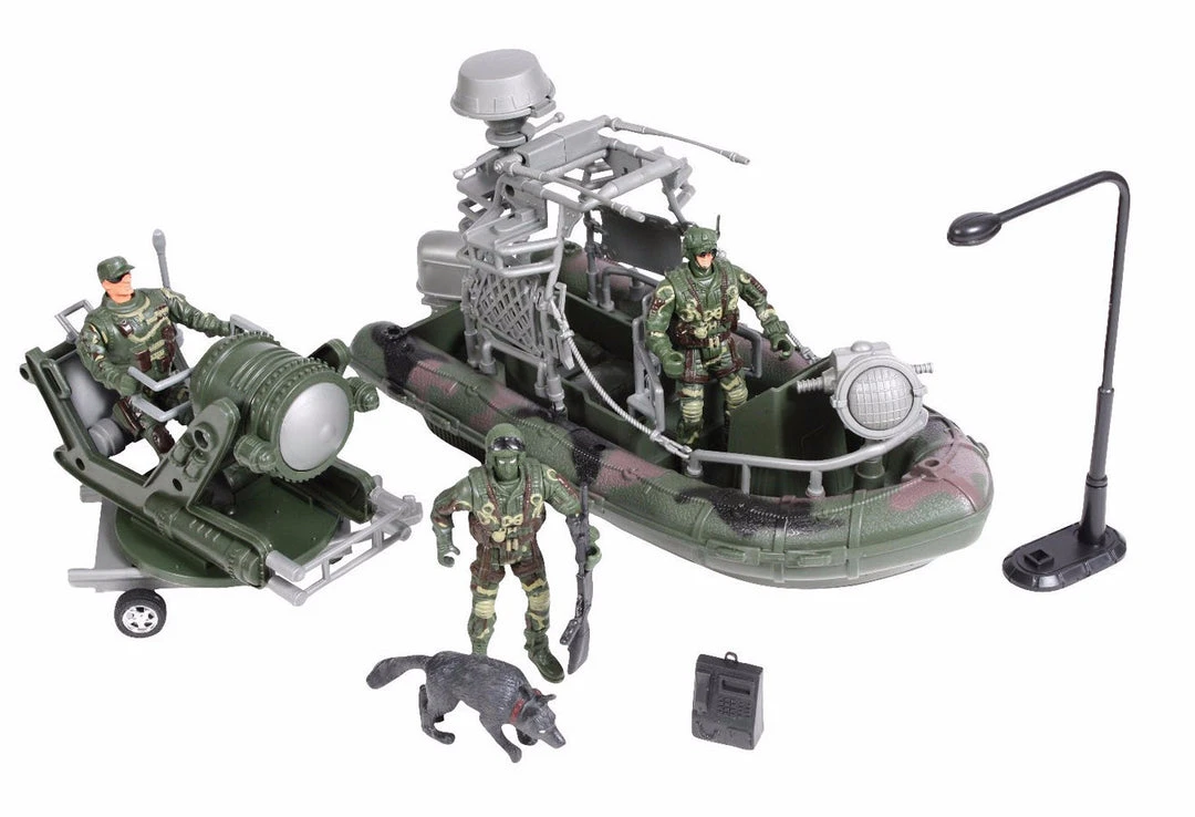 - Includes: 3 Men, 1 Dog, 1 Boat & 1 Spotlight Trailer