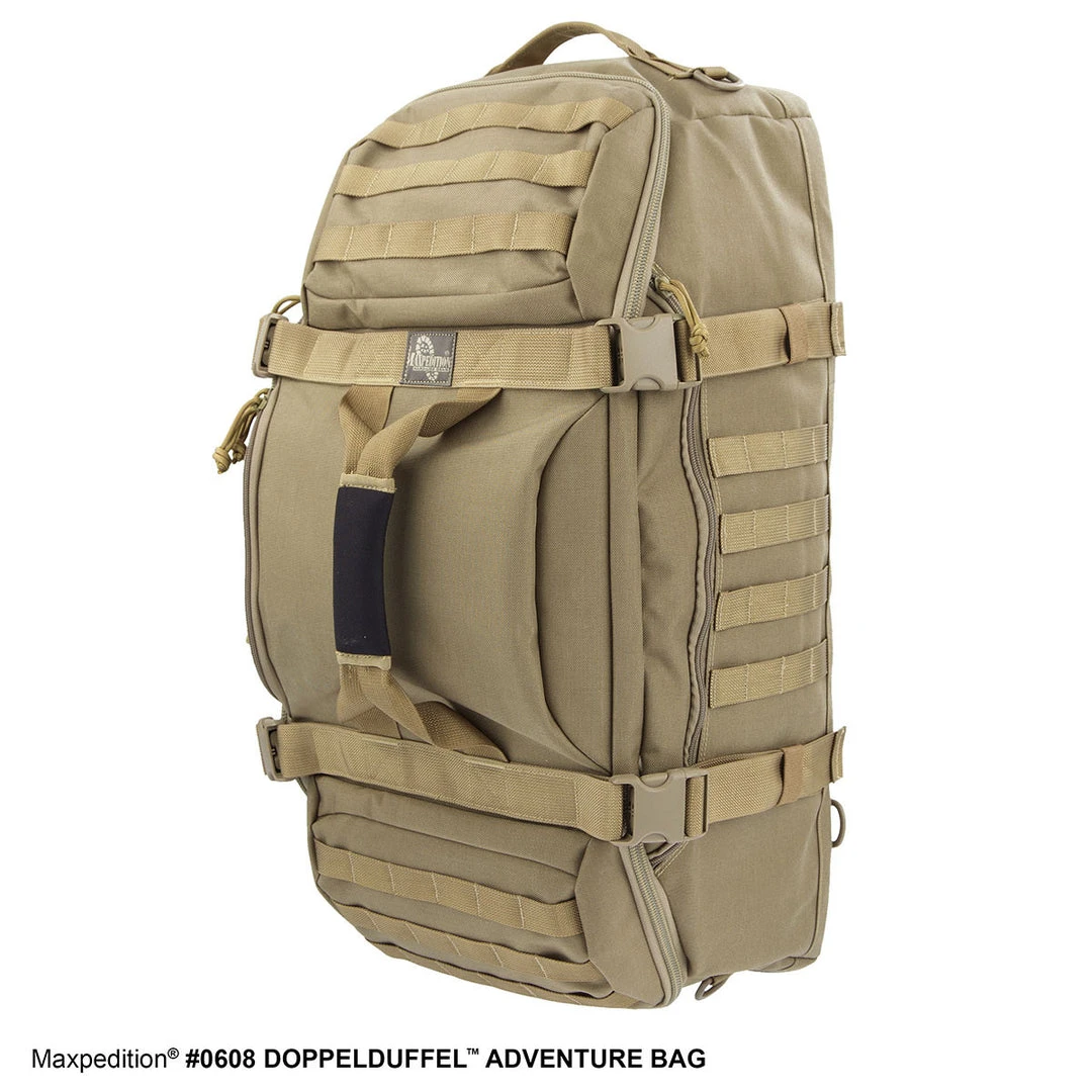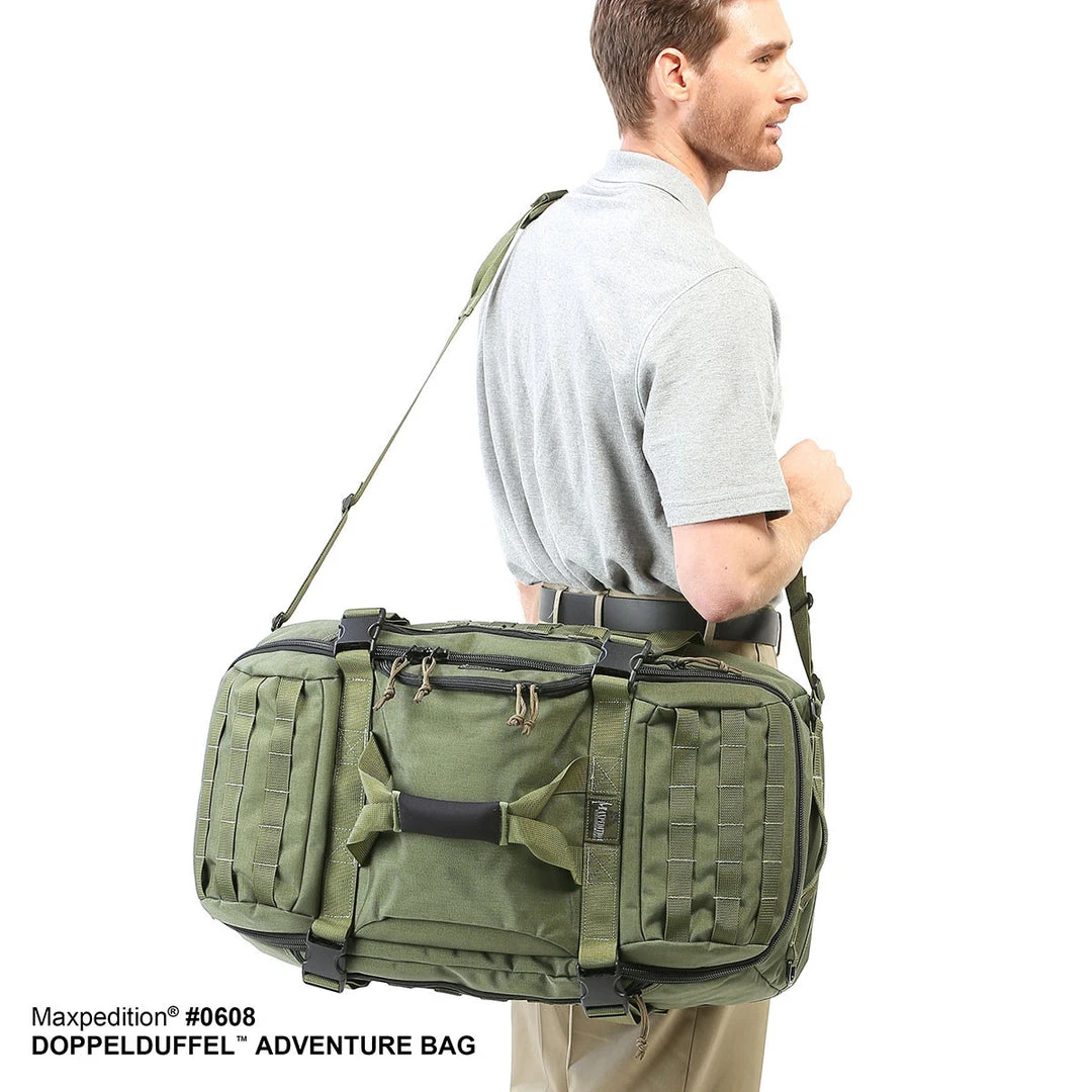 The Maxpedition Doppelduffel Adventure Bag is a unique travel bag that can be carried by hand, by shoulder strap (in 2 orientations), or by it’s concealable ergonomic backpack straps. Multiple pockets, pouches, and compartments offer plenty of space and organization, and the main interior is equipped with 2 padded dividers for splitting the main compartment into smaller sections. –