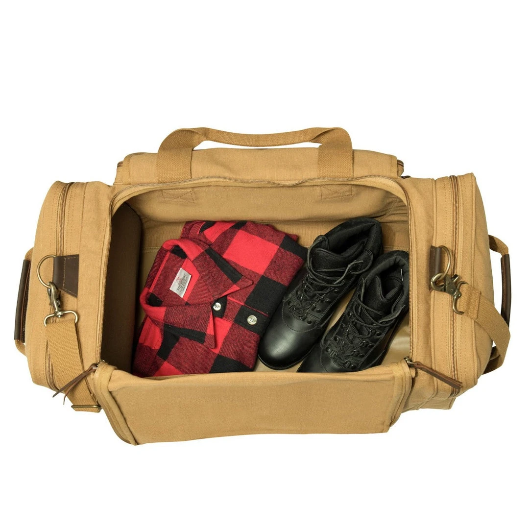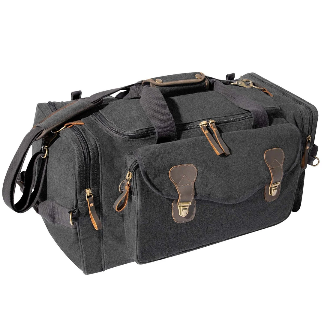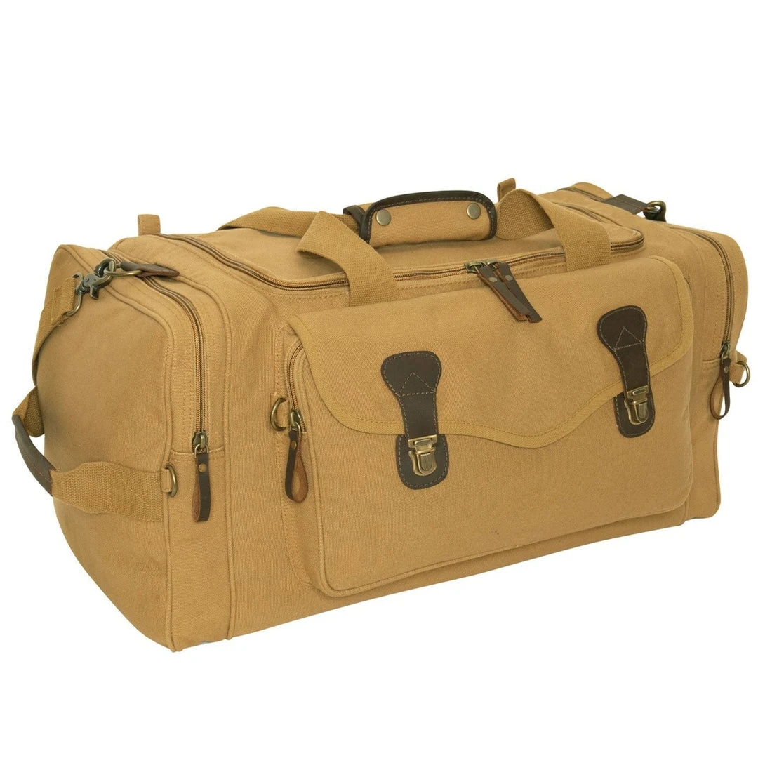 Rothco Canvas Long Weekend Bag is the perfect bag for a weekend getaway! The bag features classic canvas, leather accents and antique brass hardware. The bag features 1 front zippered pocket with flap and brass closure and 2 zipper side pockets, great for storing toiletries and other travel accessories. The bag also features 2 convenient carry handles, an adjustable shoulder strap and leather zip pulls.