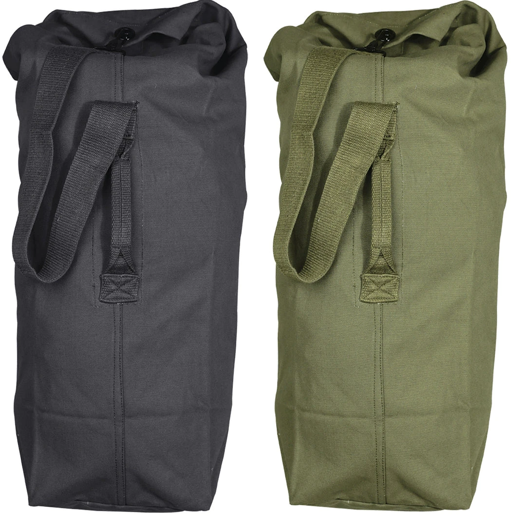 This is your standard design top load duffle bag. Designed for both functionality it’s also made to be durable for a lifetime of use. Constructed of durable 100% cotton canvas these duffle bags are made to carry a lot of gear. The duffle bag has a fully adjustable shoulder strap which also works as a side carry handle. For added security the bag includes a center snap hook shackle to lock bag when closed.