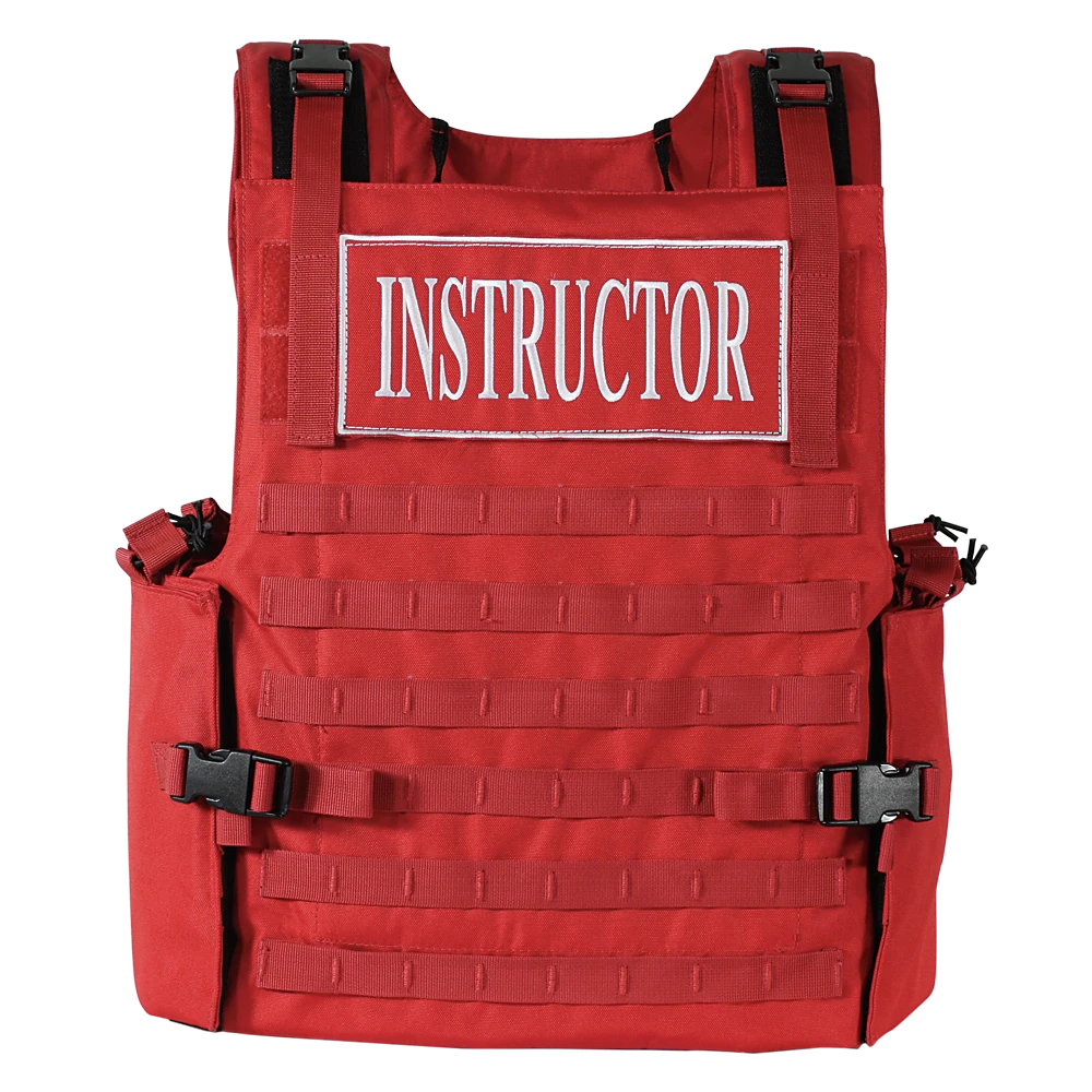 Holds 8″x10″, 10″x12″ plates (not included) securely in the padded front and back pockets, with added adjustable, padded side storage for 5″ x 8″ soft plates (not included). Inner support comes from a wide, adjustable hook-n-loop and elastic waistband. Padded shoulder supports are fully adjustable and web straps are hook-n-loop backed to lay flat on chest. Added “D” rings on shoulder for flashlight attachment. Rescue grab handle in back and unit I.D. hook-n-loop for front patch placement. Inside comfort cooling mesh storage for hydration bladder or maps and documents. Loaded with universal straps, front, back and sides for modular pouch attachment, with added front and back “INSTRUCTOR” patches. Safety Red for high visibility on the range. One size fits most.