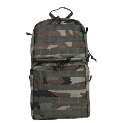 An enhanced hydration pack with padded foam comfort back and padded shoulder straps. Seven rows of universal straps on the 2 rear compartments. Right or left side hose exits with elastic straps on shoulder pads. Deluxe bladder included with color matched neoprene hose cover included.