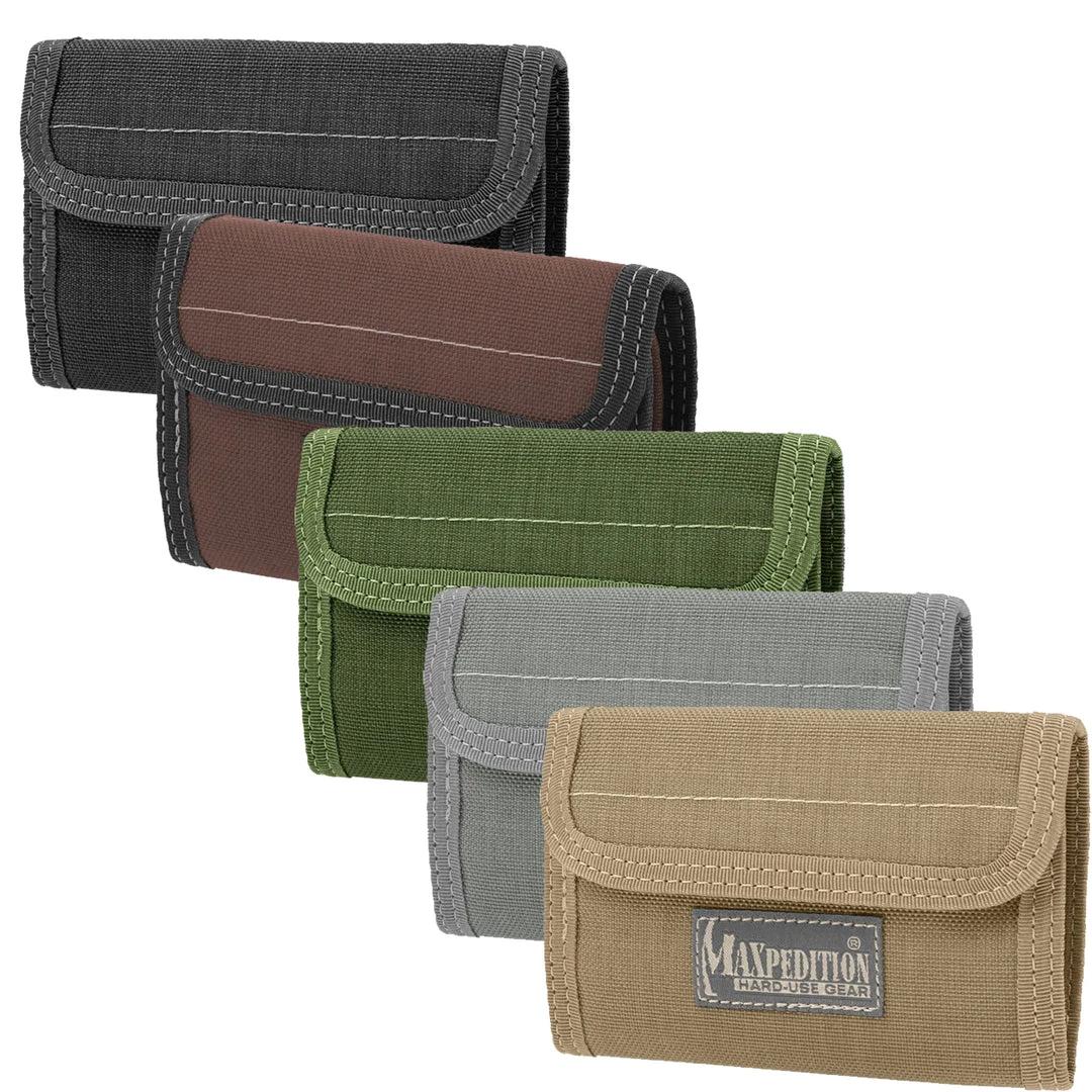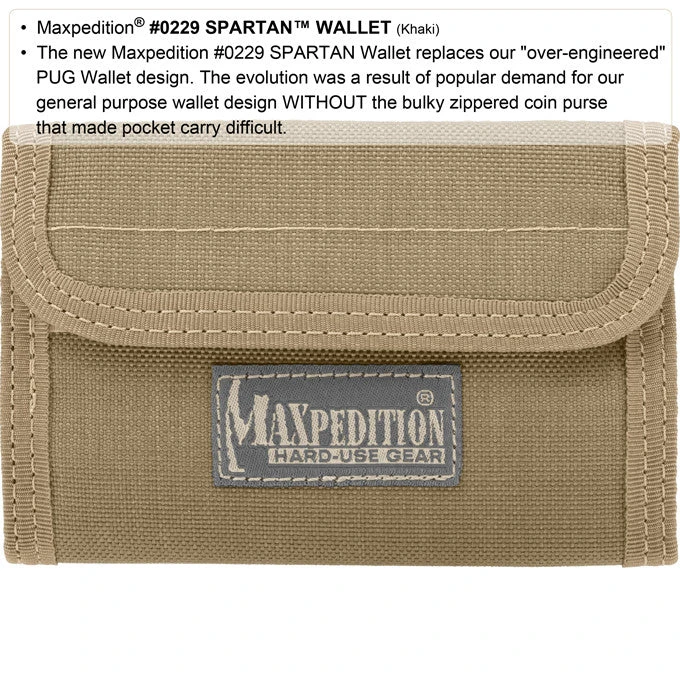 General-purpose folding wallet best when traveling and protects items from slipping The new Maxpedition #0229 SPARTAN Wallet replaces our “over-engineered” PUG Wallet design. The evolution was a result of popular demand for our general purpose wallet design WITHOUT the bulky zippered coin purse that made pocket carry difficult. Our customers were right; this simplification makes for a much better yet less expensive wallet. The SPARTAN still contains a plethora of small compartments secured with velcro tabs to prevent slippage. Two longer slots for paper bills make carrying multiple currency types easy. An external mesh pocket is great for quick access to ticket stubs or to separate receipts.