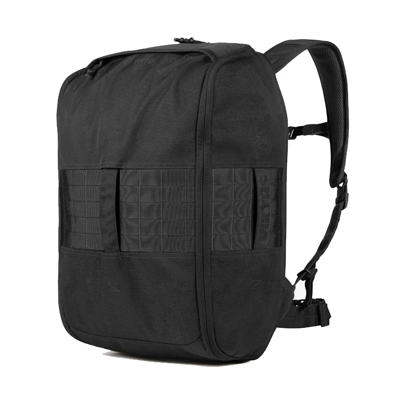 A hydration bladder pocket accepts up to a 3-Liter bladder, complete with hose access port and routing. Padded backpack shoulder straps are stowable to keep the bag completely clean of snag hazards. Dual webbing straps on the back of the Kadre allow it to be placed onto the handle of most wheeled luggage. Whether your range is a five-star VIP bunker or a primitive flat-site, the Kadre will ruck all your essentials. Overall dimensions 21″ H x 13″ W x 9” D.